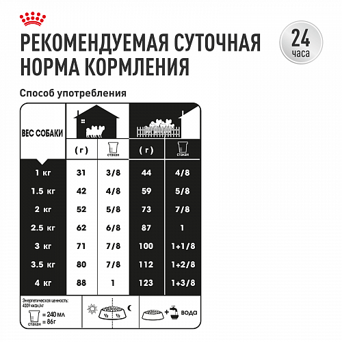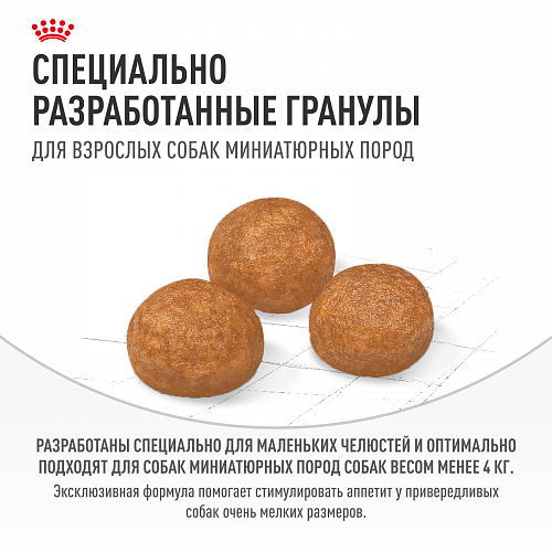Корм сухой полнорационный для взрослых собак (старше 10 месяцев) очень мелких размеров (весом до 4 кг), учитывающий их специфические особенности (в частности, миниатюрные размеры челюстей, высокие потребности в энергии, склонность к запорам).
