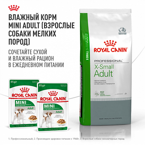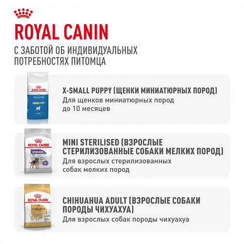 Продукт ROYAL CANIN® X-Small Adult (Корм сухой полнорационный для взрослых собак очень мелких размеров) предназначен для собак миниатюрных пород старше 10 месяцев весом до 4 кг и разработан специально с учетом их потребностей в питательных веществах.