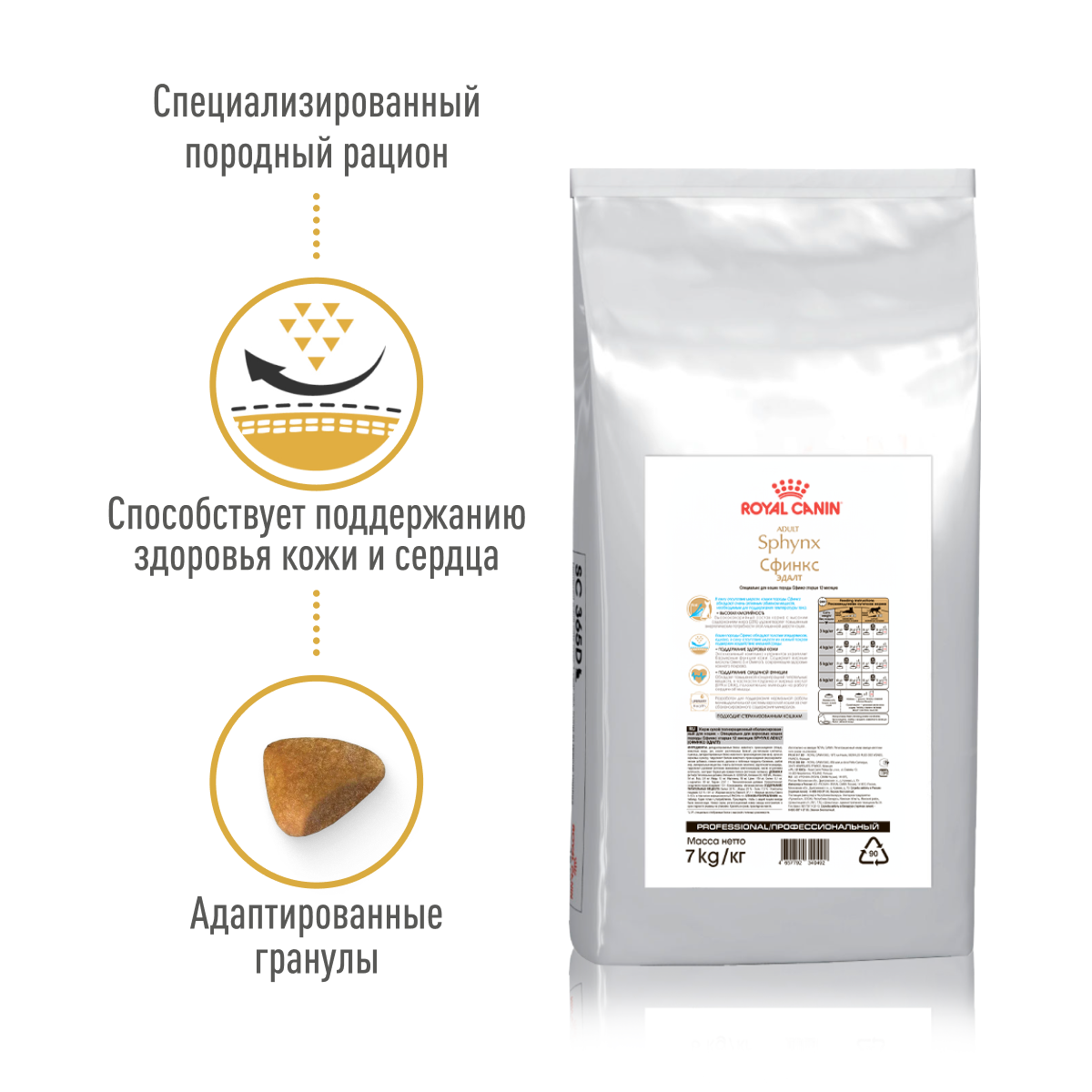 Рацион ROYAL CANIN® SPHYNX (Сфинкс эдалт) учитывает особые потребности взрослых кошек этой породы и способствует: удовлетворению высоких энергетических потребностей (за счет высокого содержания калорий); поддержанию барьерной функции кожи; поддержанию здоровья сердца; 100% полнорационное и сбалансированное питание.