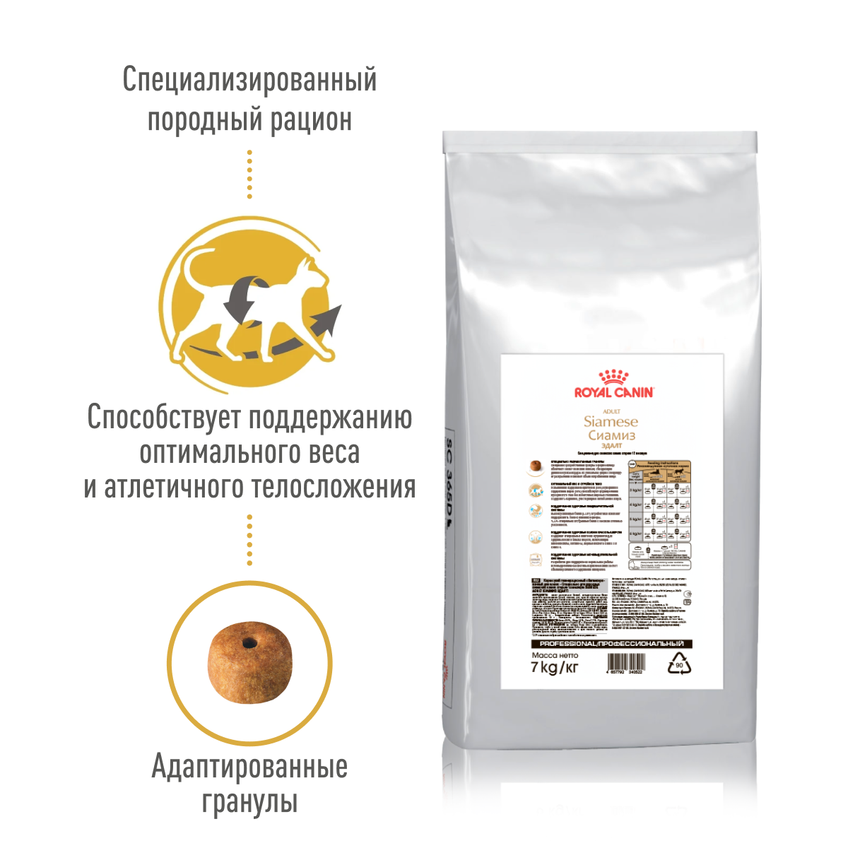 Рацион ROYAL CANIN® Siamese Adult (Сиамиз эдалт) учитывает особые потребности взрослых кошек этой породы и помогает: поддерживать оптимальный вес и атлетичное телосложение; поддерживать здоровье пищеварительной системы; поддерживать здоровье кожи и красоту шерсти; 100% полнорационное и сбалансированное питание.