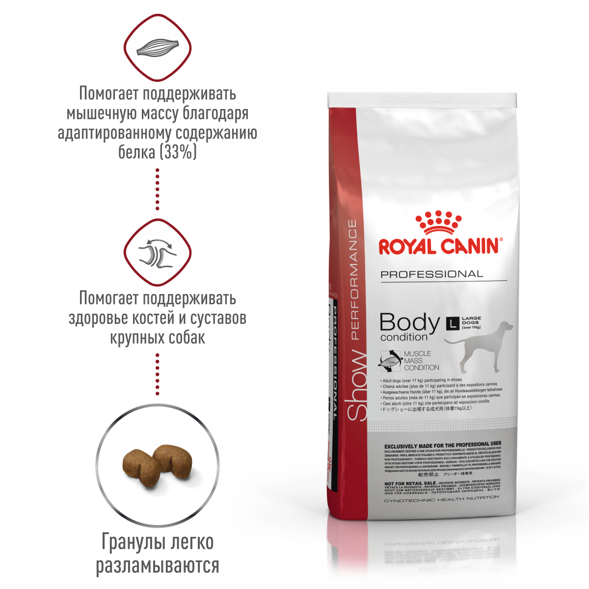 Корм сухой полнорационный для выставочных собак весом от 11 кг. В сочетании с регулярными тренировками SHOW BODY CONDITION PERFORMANCE помогает поддерживать мышечную массу благодаря адаптированному содержанию белка (33 %) и L-карнитину.